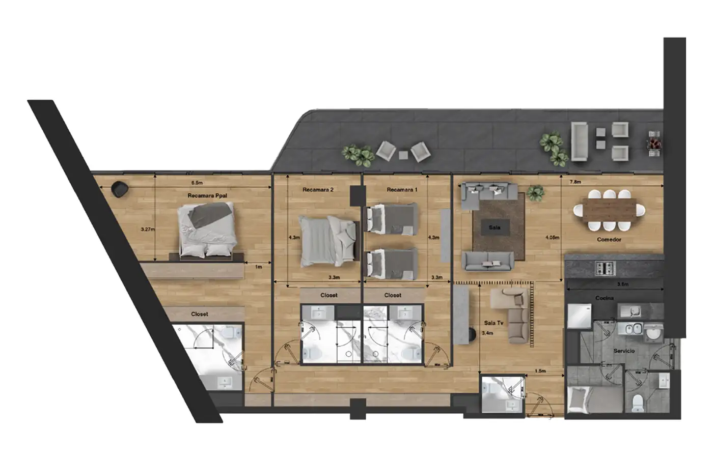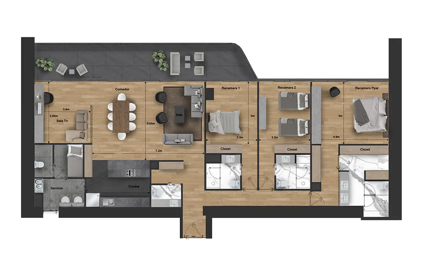 Departamentos de 300 a 450 m² de tres recámaras.